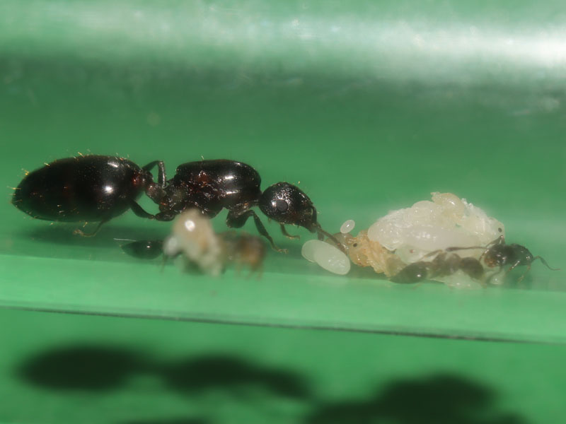 So, the day after I released the post on my Lasius colonies, I discovered that this Crematogaster Queen was no longer alone in her nest! At the time, she had one nanitic, but that has quickly increased to six nanitics! The nanitics are tiny compared to the queen, who is eight millimeters long. This colony has also had their first meal, which was mealworm pieces. They are quite healthy at the moment, and they seem to love mealworms.