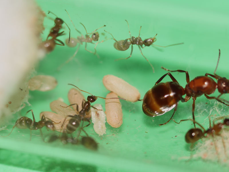 After Scar Smile moved into her founding nest, for some reason nanitics started dying. I concluded that the cause of the mysterious deaths was the new nest drying out too quickly. However, I realized this after all of the nanitics had died. In a last attempt to save the queen, I quickly crafted a recovery chamber consisting of a medium-size test tube setup, and an AntsCanada test tube portal, which acted as a mini foraging area. Once the temporary home was ready, I rescued the queen and some brood, as that was all that was remained of the colony. Fortunately, the queen was very cooperative and quickly moved into the test tube with her remaining babies. I also made sure to feed her to provide energy for a new set of nanitics. Not too long after this life-saving move, she had three new nanitics. This is how she would remain for the next couple of months while they reared another batch of nanitics. The new set consisted of ten pupae, four of which have now eclosed into adult ants. In the vast majority of cases, when a queen ant has fewer than four nanitics, she is doomed. However, that isn’t always the case, as Scar Smile is demonstrating.