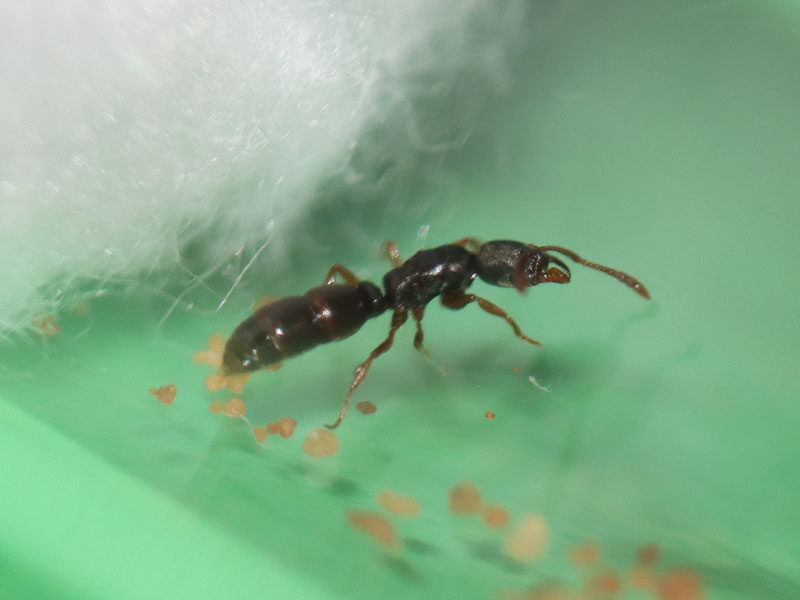 On Tuesday, I was looking for queen ants, and I spotted an odd looking ant. I caught her in a snap cap vial, and realized she was a Ponera sp queen! These ants are rarely seen, and they are semi-claustral, which means the queens must leave their claustral chambers to forage for food. Below is an image of my Ponera queen.