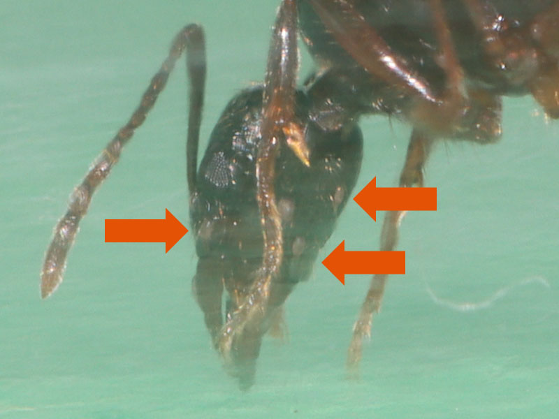 When I photographed this queen on day one, I noticed she had mites on her head. These mites are Phoretic, which means that they ride a host and then disperse to a new area. Good news, this type of mite does not have mouths or anuses at this life stage, so they will not kill this queen. They will not develop mouths and anuses until after they detach from their host. This Phoretic stage is called the Deutonymph stage. The mites at this stage are just hitching a ride to better conditions.