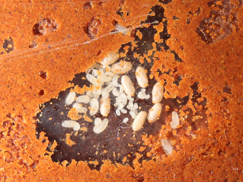 Well, one morning this week, I had a look into The Proliferator’s nest chamber, and I saw her first pupa! As of today, she has eight, all of which are in silk cocoons. In the lower right corner of the screen, you can even see two of the larvae working on their cocoons.