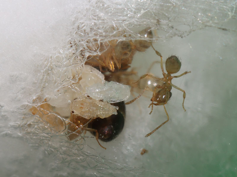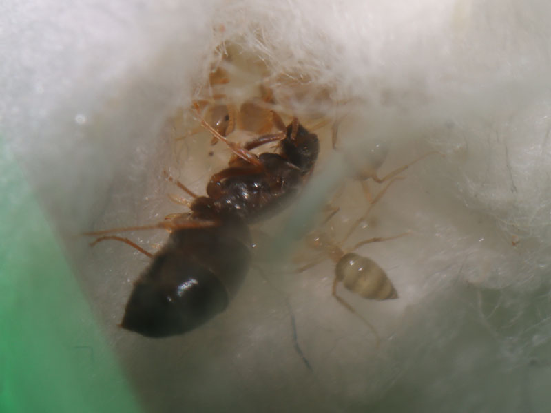 Over the past week, I was in Oregon, so I wasn’t able to see my ants. It was slightly annoying since two of my N. parvula queens were about to have nanitics. I decided to feed all of my nylanderia queens honey to ensure none would die while I was not home, and when I came home, two of them had nanitics. These queens have fewer than ten nanitics, but they should have more soon. The nanitics are significantly smaller than the queens, who are themselves tiny.